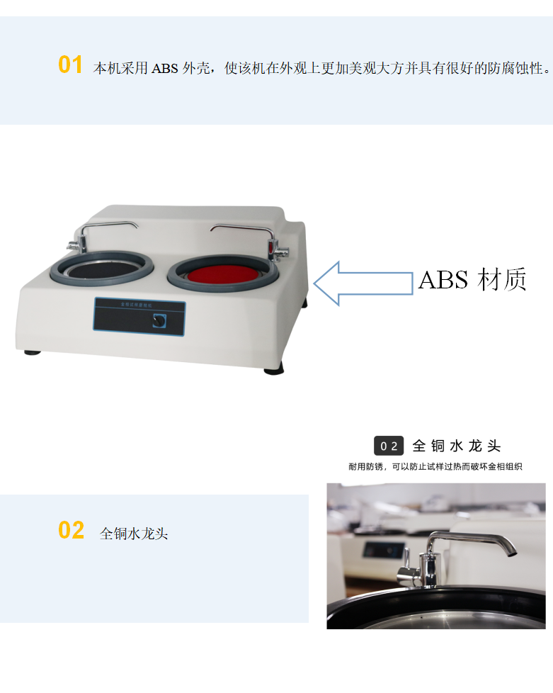 該磨拋機由底座、研磨盤、拋光盤和塑料壓制的擋水罩組成。左盤為研磨盤,右盤為拋光盤。本機采用ABS外殼,使該機在外觀上更美觀大方。