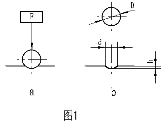 金屬布氏硬度試驗(yàn)系采用一定直徑硬質(zhì)合金球,以規(guī)定試驗(yàn)力壓入被測(cè)材料表面(圖1a)按規(guī)定保持時(shí)間后,卸除試驗(yàn)力,(圖1b)測(cè)量試樣表面的壓痕直徑,以計(jì)算出布氏硬度,并以下式計(jì)算之: